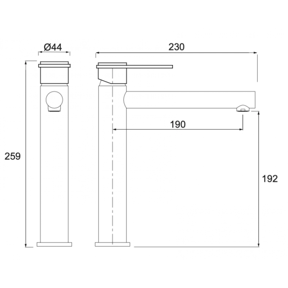 Sleek minimalist black with copper styled handle and base. Electro-plated finish, cylinder shaped vessel mixer. Perfect for mounting behind a raised bowl on the vanity. Quality European ceramic cartridge. German flow regulator.